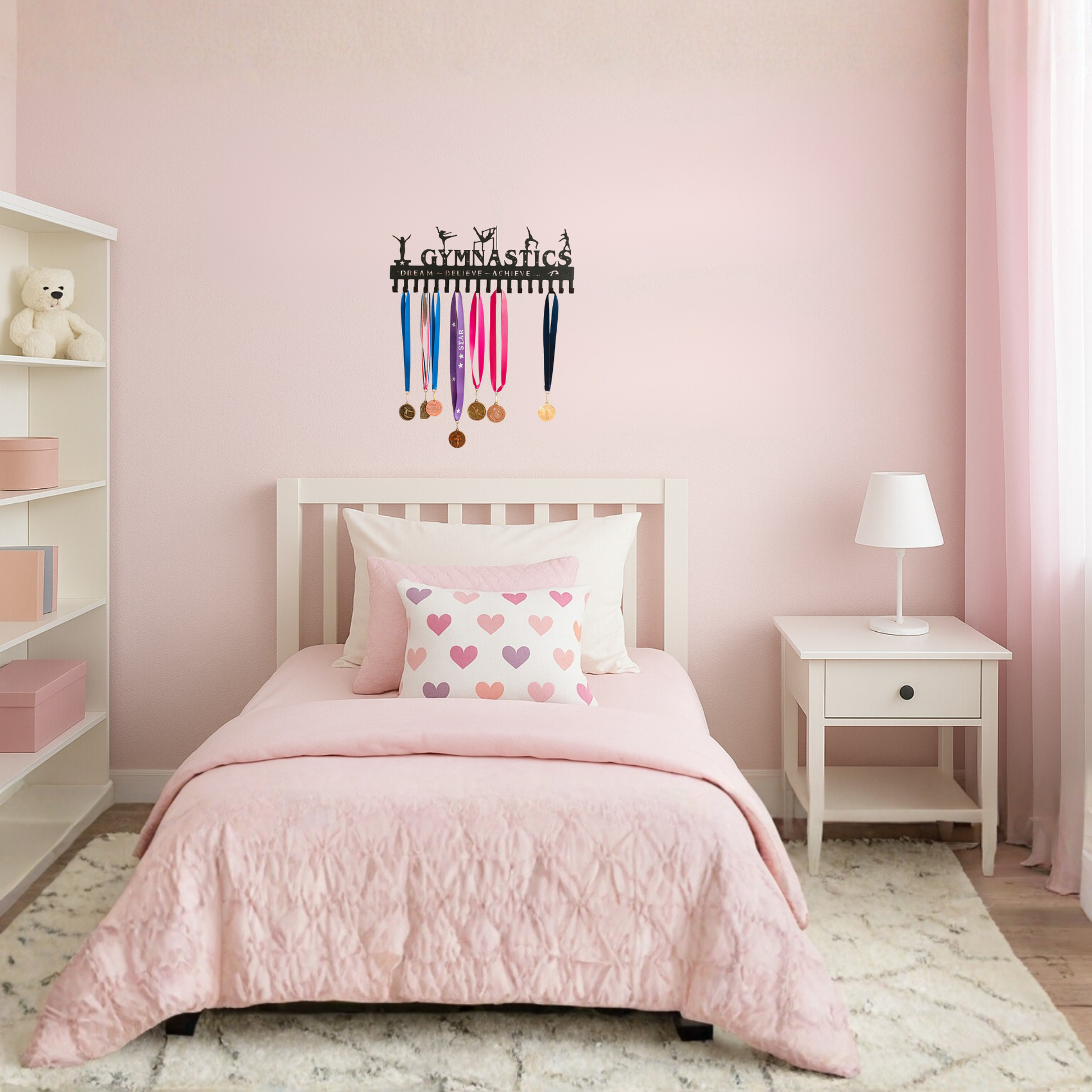 This elegant metal medal hanger is perfect for any gymnast who wants to display their achievements in style. Featuring graceful gymnast silhouettes and the inspiring words “Dream • Believe • Achieve,” it adds the perfect motivational touch to any room.